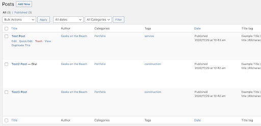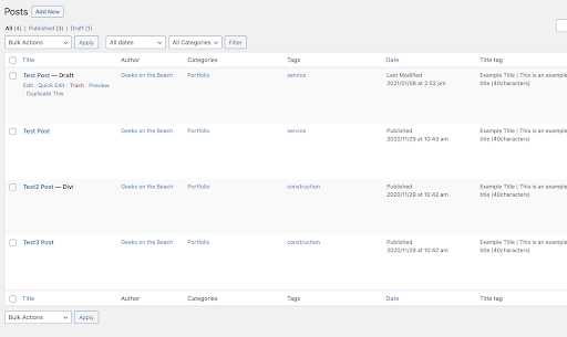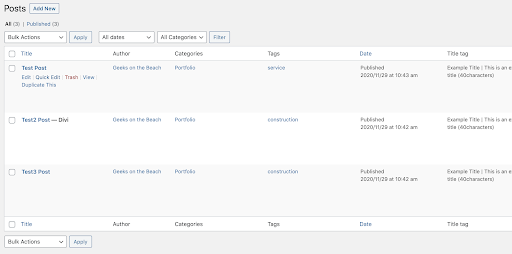 We recommend having GOTB set up your first post for you to ensure the routing and display of your posts are set according to your expectations. This is how you add new posts based on the example post set by GOTB. The idea is to simply duplicate an existing post that already has the correct settings & to simply alter the content and images: